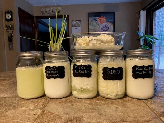 Alas, my homemade yogurts with different types of beneficial bacteria.
