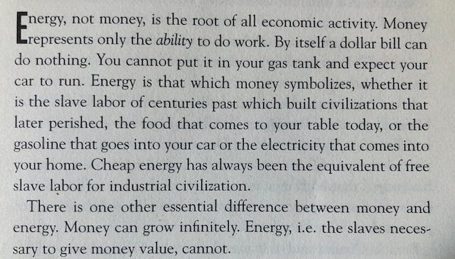 A ten-year bond needs ten years of economic activity to pay the bond back. That's based on 10 years of future energy. Meanwhile, a gold bar is based on energy that was used in the past, at much cheaper prices than the present and future. The government creates credit to buy energy at higher costs in the future, while the gold miners make money that maintains its value against the future cost of energy. It's all about energy, and nobody made this clearer than Michael C. Ruppert...