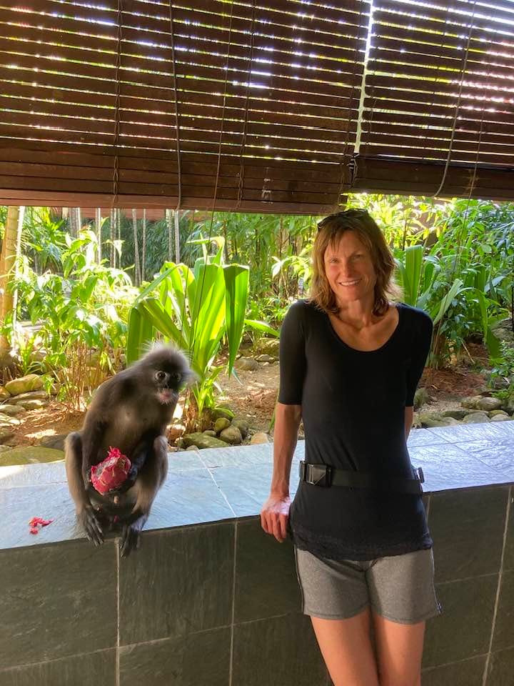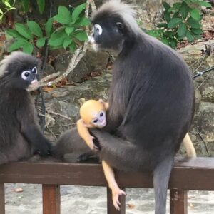 A few days ago, I saw a troop of monkeys meandering through the resort where I was staying in Langkawi. The resort was rather isolated and the food wasn’t super, but there were monkeys all over the grounds, and they weren’t afraid of us humans. Once in a while, I spotted a loner, but for the most part, they moved around together in troops. There was one troop with a mama whose baby hung on her chest. It was bright yellow and looked like a toy (pictured right).
