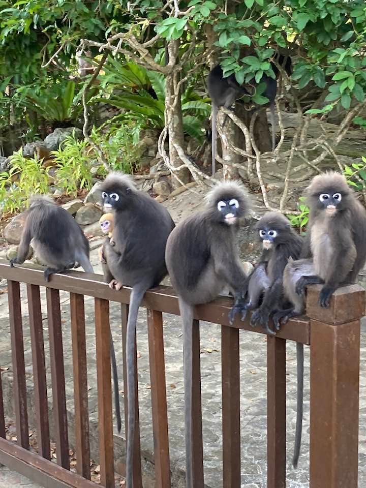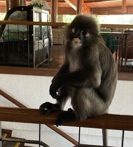 The other kind of monkey is the Long-Tailed Macaque. Unlike the Dusky Leaf, this species is noisy and aggressive. I saw them only by car on the road into the resort (no photo), and was warned to stay away. They travel in large troops up to thirty, whereas the Dusky Leaf travel in troops of ten or fewer. Like people, monkeys come in all shapes, sizes, temperaments, and mentalities. And it’s important to keep windows and doors locked when you’re not home!
