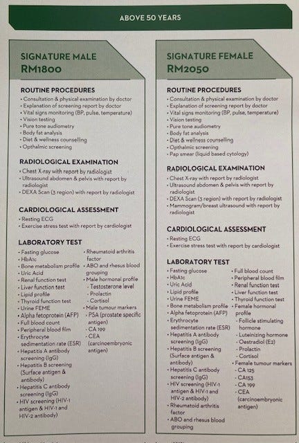 On the first day, I meandered over to the Pavilion KL Shopping Centre where I enjoyed a $4 lunch (pictured to the right) and a glass of fresh-squeezed carrot juice for $2. My belly couldn't have been more content writing this post from the 29th floor of a bright skyrise. Even those heavy rains in the afternoons are delightful, humming and drumming against the large glass windows. Just a few days in, I'm looking forward to exploring this multicultural country, and will be writing about my experiences in the next several posts. Why am I here? For years, I've been looking for a suitable place to launch the next stage of my life. Sometime after my youngest son starts college in the fall, I'll hopefully be slow-transitioning to a small self-sufficient farmstead, where I can spend most of my time working and playing outdoors. I'm not sure yet if I want to do that in Portugal, Uruguay, Malaysia, or Colombia. There are advantages and disadvantages with each opportunity, and the only way to determine what's best is to visit these idyllic places, get a reality check from the experience, and imagine my day-to-day life there. As far as Southeast Asia goes, Malaysia is the only place where foreigners can own land. While you're reading this post, I will have just finished my checkup at Prince Court Medical Centre. PCMC is among the world's top ten hospitals for medical tourists and is the top in Malaysia, awarded by Medical Travel Quality Alliance (MTQUA), USA. I got a Signature Female Health Screening for about $446. See the pic below.